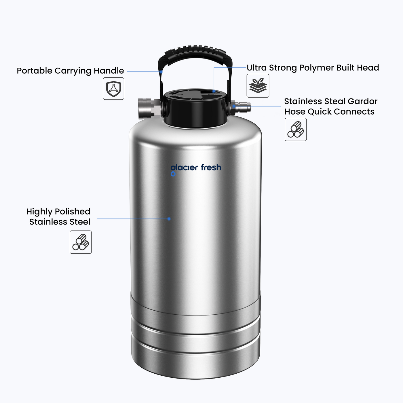 verfügt über einen robusten Edelstahltank und Schnellanschlüsse, wodurch das System langlebig und korrosionsbeständig ist; enthält einen Schnellanschluss-Rückspüladapter aus Edelstahl.