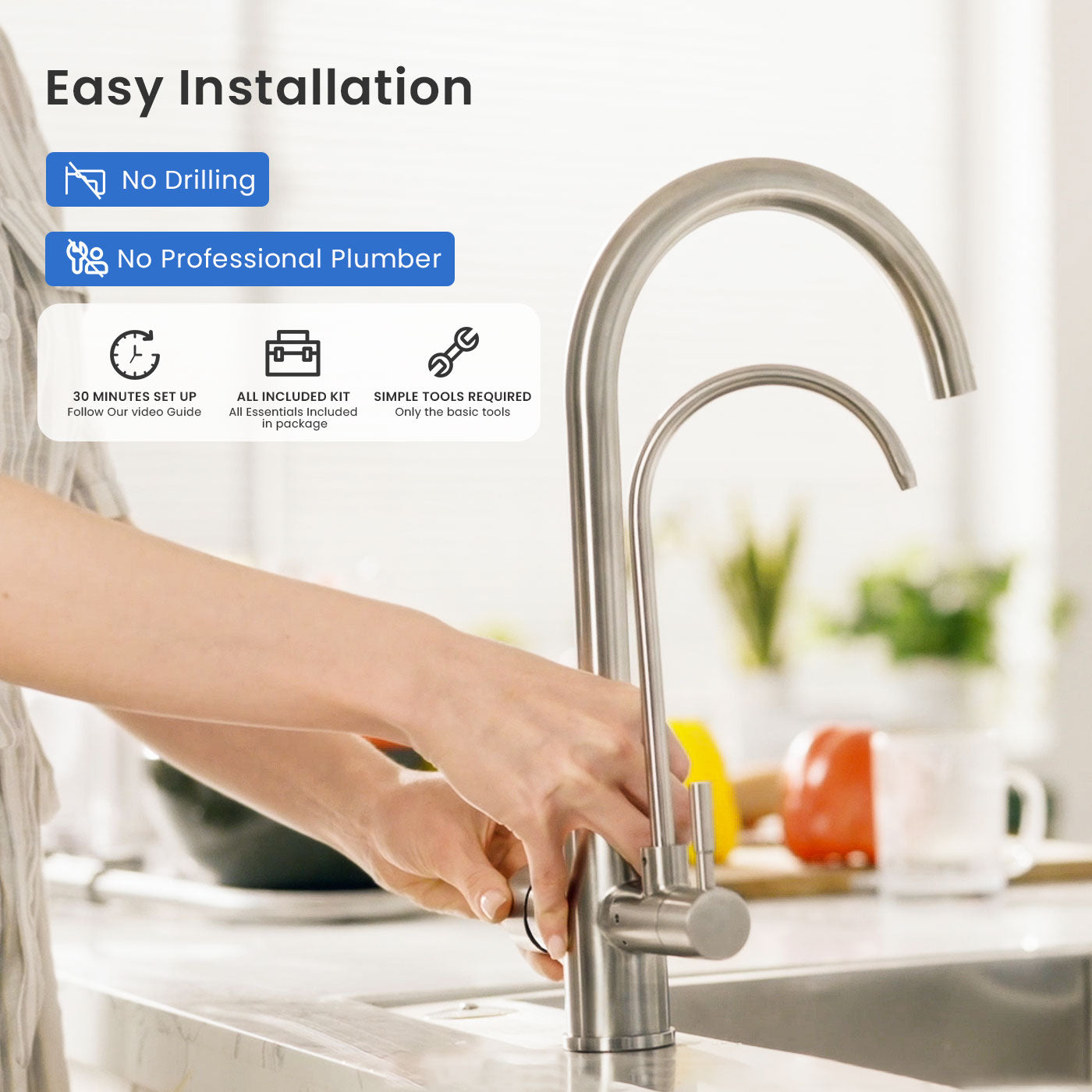 Kommen wir nun zur Installation. Sie ist unkompliziert, selbst für einen Laien wie mich. Auch der Filterwechsel ist kinderleicht. Kein Spezialwerkzeug nötig. All-in-One-Gerät, kein Klempner oder Handwerker nötig, Sie können es ganz einfach selbst installieren, gemäß unserer Bedienungsanleitung.