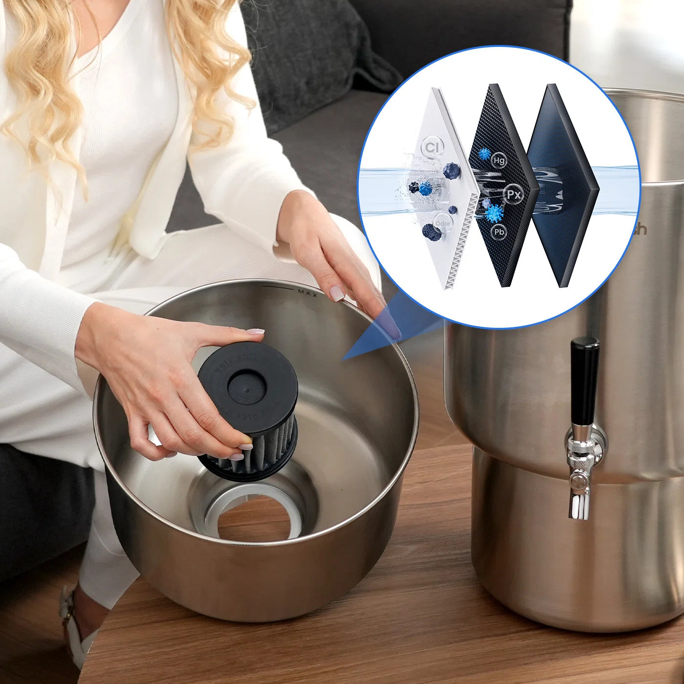 Our solution: Replaceable cartridge (~200 gallons / ~ 3 months) and a filter lifetime indicator make upkeep simple.