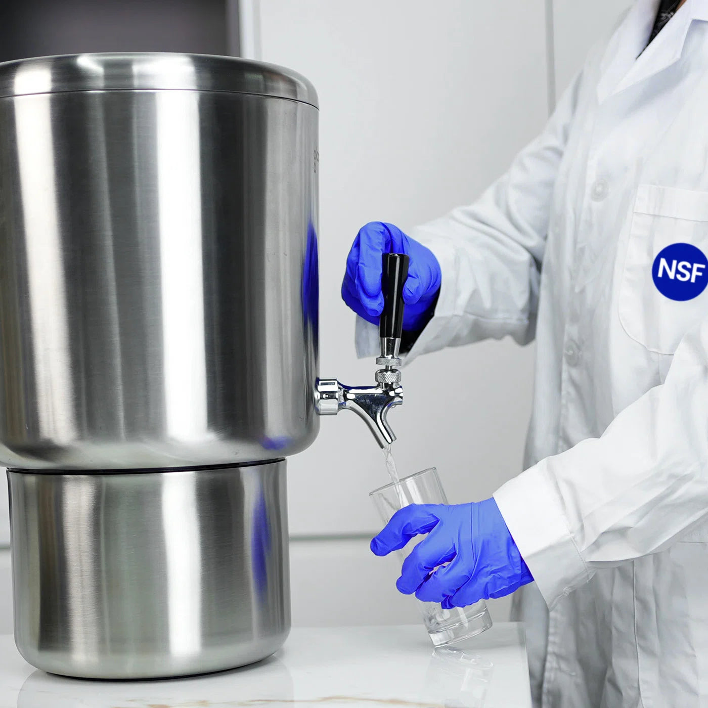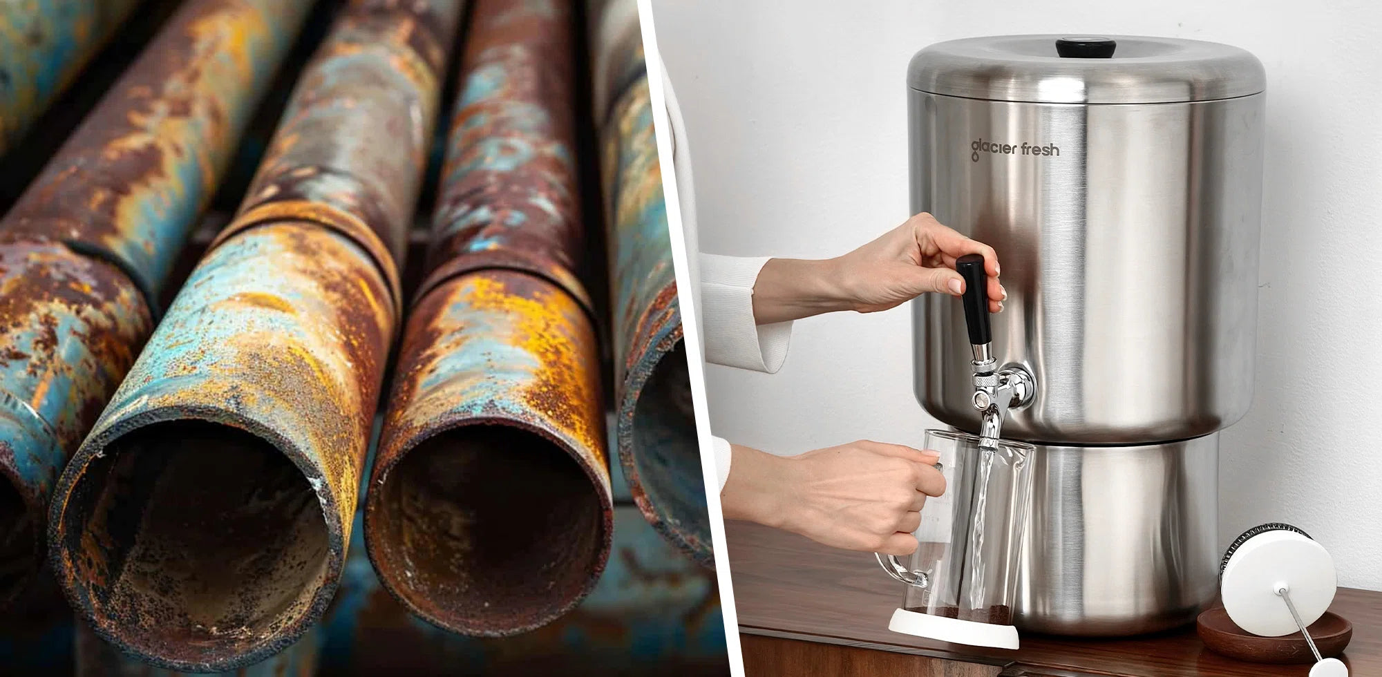 Glacier Fresh 2.25G Countertop gravity water filter was built for those concerns: A 2.25-gallon stainless-steel countertop purifier with Elarisey™ filtration. Independent SGS tests show substantial reductions of lead, chlorine and PFAS, etc. No plumbing, no electricity — just pour and drink.