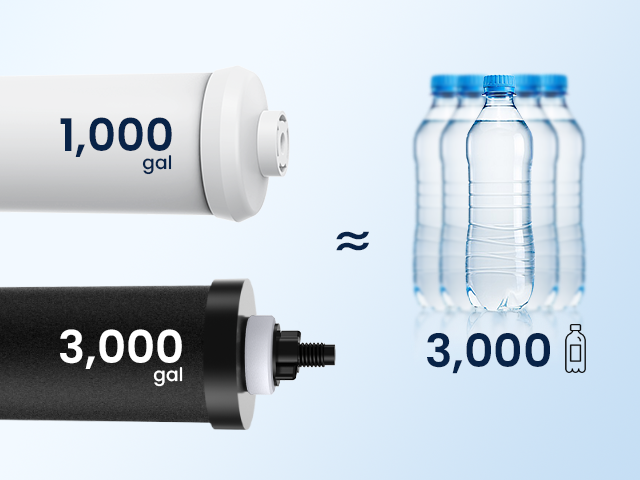Activated carbon filters have a life of 3000 gallons and reduce trihalomethanes, inorganic minerals, heavy metals, pharmaceuticals, pesticides, VOCs, rust, sludge, sediment