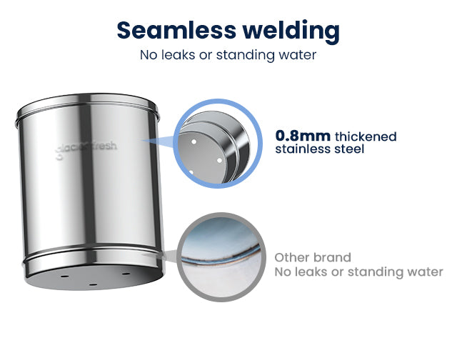 Upgrade your drinking water experience with the Glacier Fresh gravity-fed water filter system. This filtration system is carefully crafted through 18 precise processes, ensuring the highest level of quality and durability. The system is made of 0.8 mm thick highly polished 304 stainless steel, while also guaranteeing longevity and reliability.