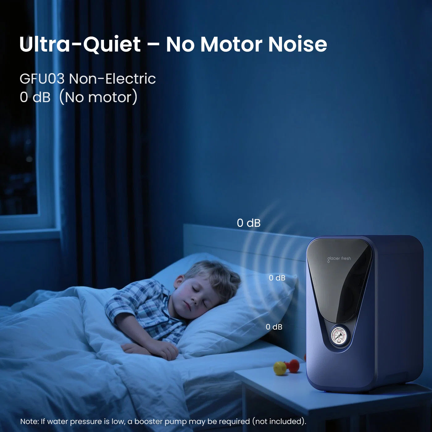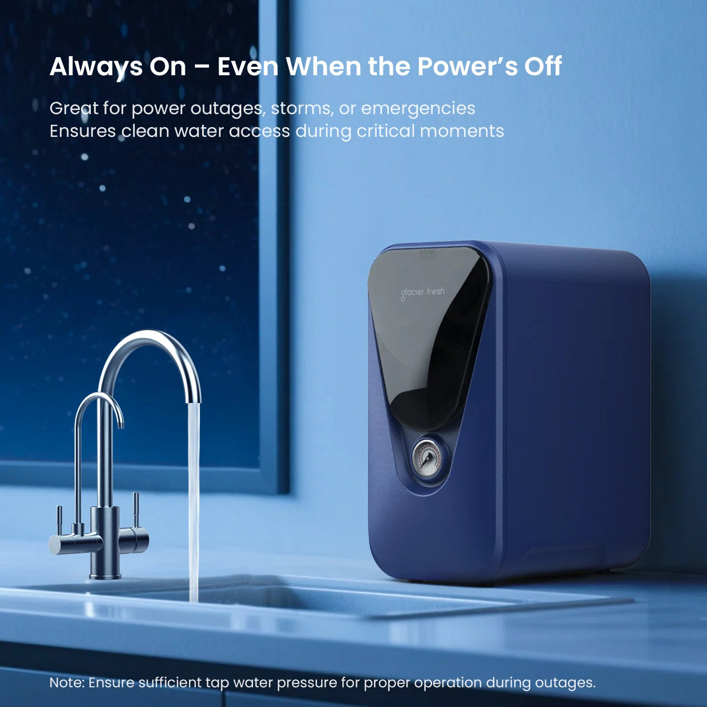 GlacierFresh U03 /OSMAX Reverse osmosis system working without electricity, So it will be more energy-efficient,No need to worry about lack of pure water due to power outage, Help you easily cope with water demand in power outage environments.