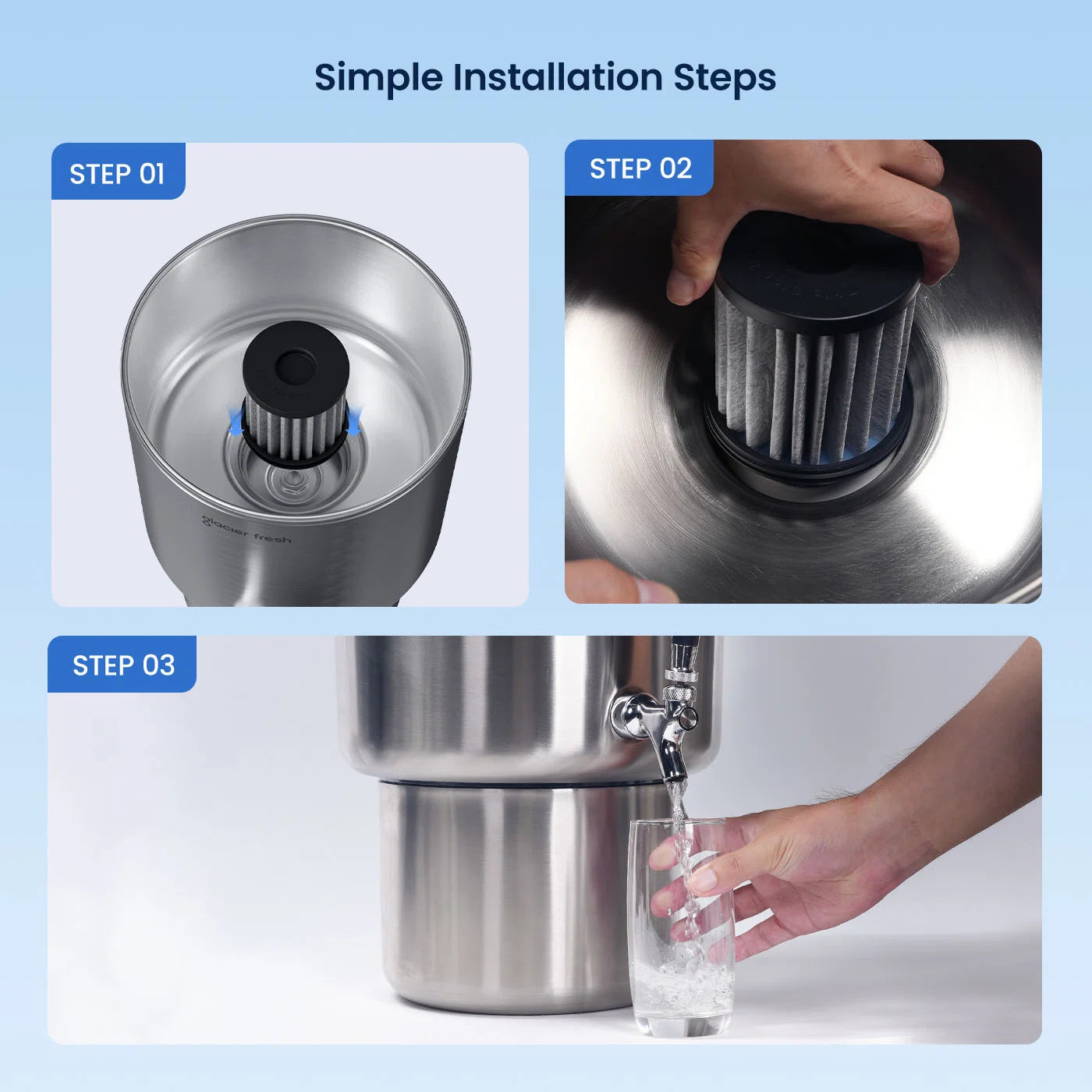 Zero Electricity Water Purifier, Gravity-driven operation — works anywhere without an outlet.