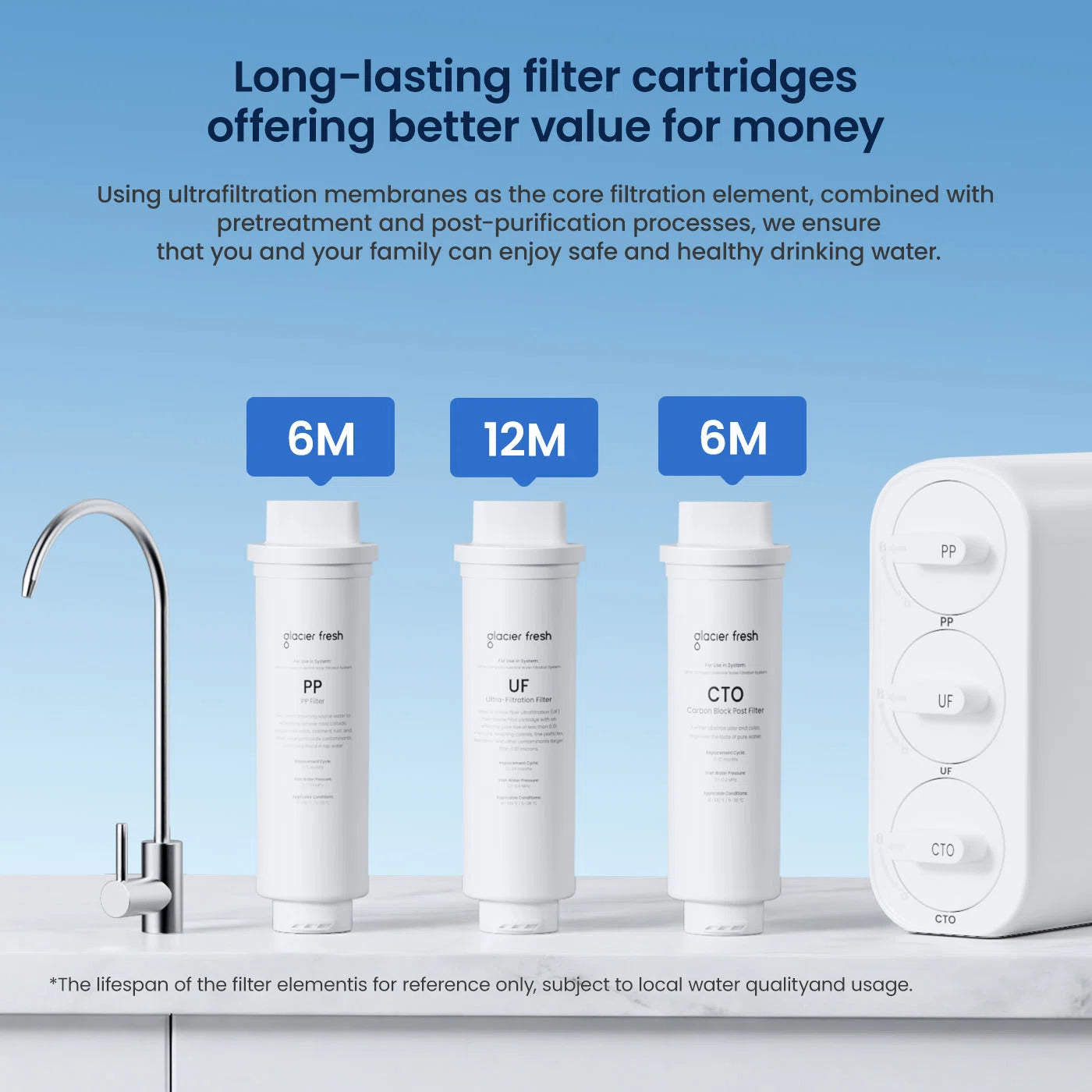 PP+CTO filter cartridges should be replaced every 6-12 months, and UF filter cartridges should be replaced every 12-24 months.
