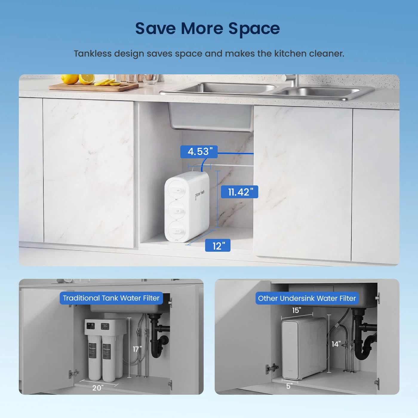 The compact, tankless design measures approximately [dimensions], saving valuable cabinet space compared to traditional systems with bulky storage tanks.
