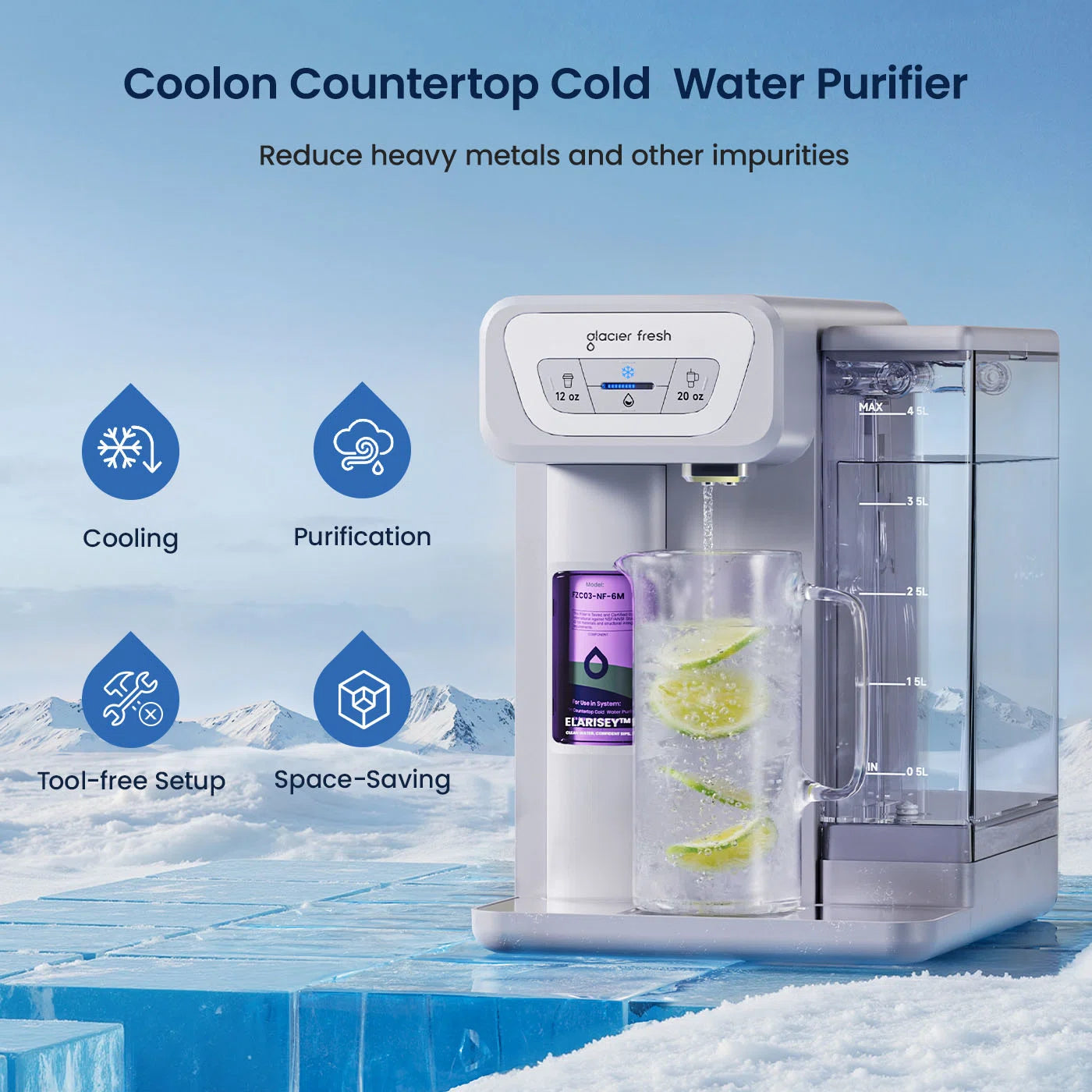 Delivers clean, refreshing cold water in a compact countertop design. It helps reduce heavy metals and other impurities while providing instant cooling—no waiting required. With tool-free installation and space-saving size, it’s ideal for homes, offices, and apartments. Easy-to-use controls and a clear water tank make everyday hydration simple, convenient, and refreshing.