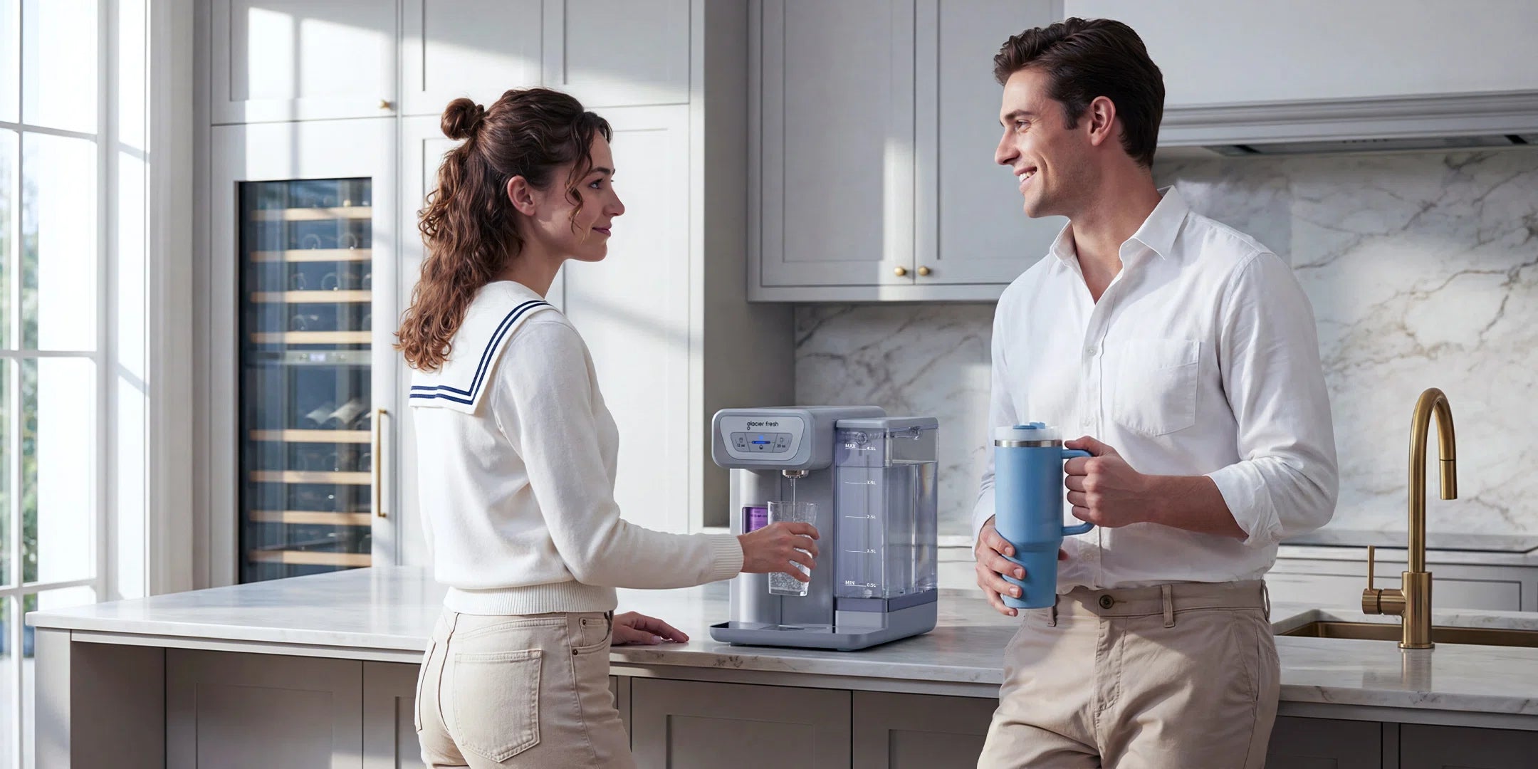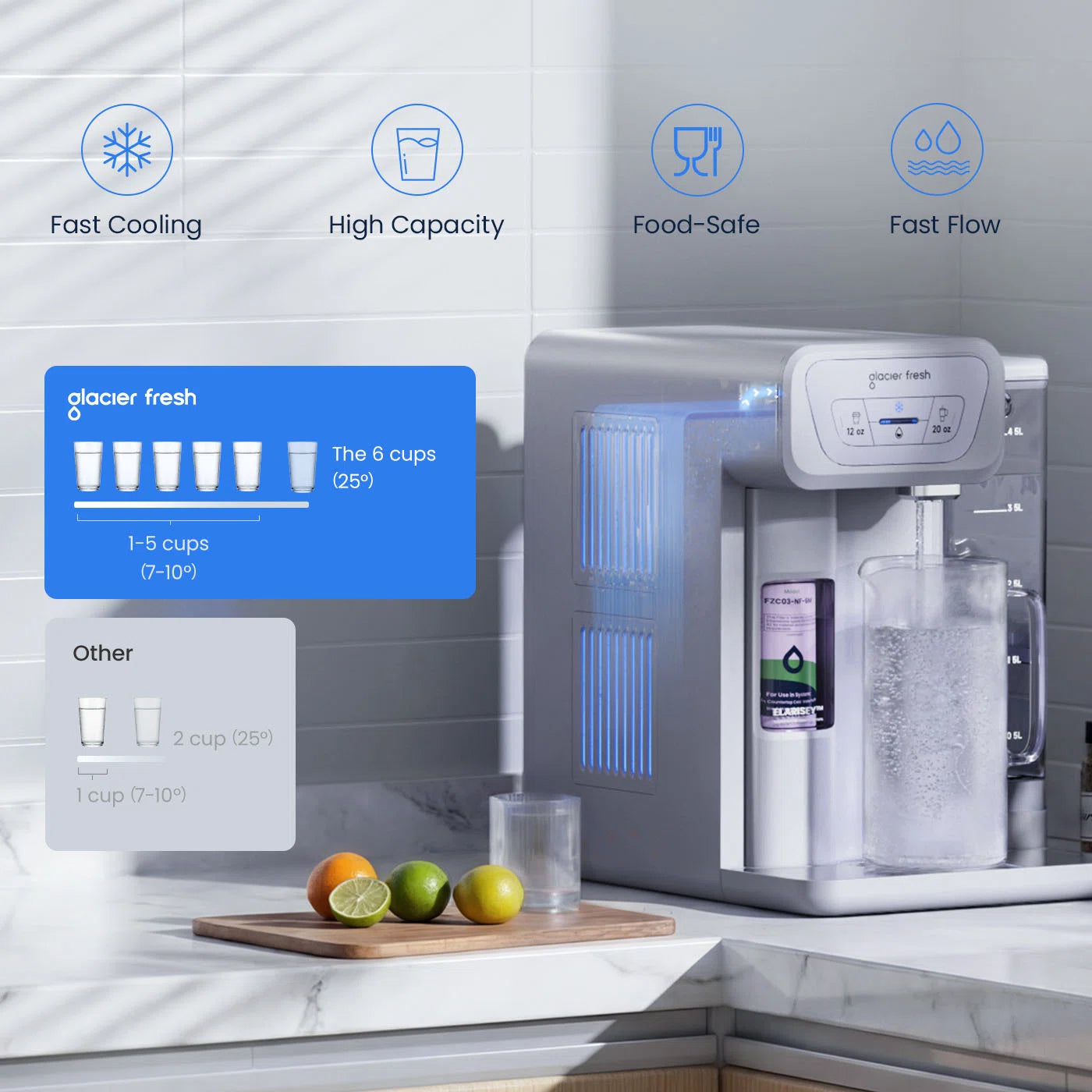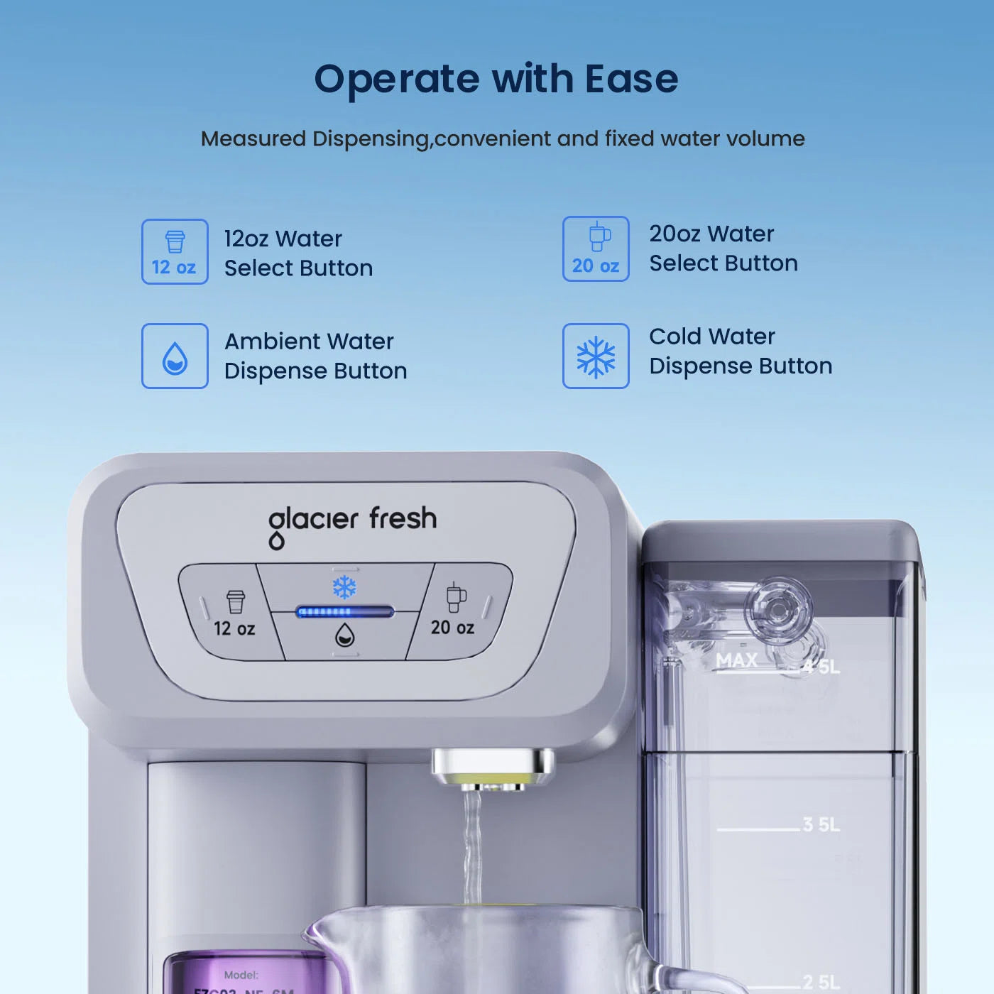 Glacier Fresh Countertop Water Dispenser features simple, one-touch operation with measured dispensing for everyday convenience. Choose between 12oz or 20oz preset volumes, ambient or cold water, all from an intuitive control panel. Designed for easy use and consistent output, it makes hydration effortless at home or in the office.